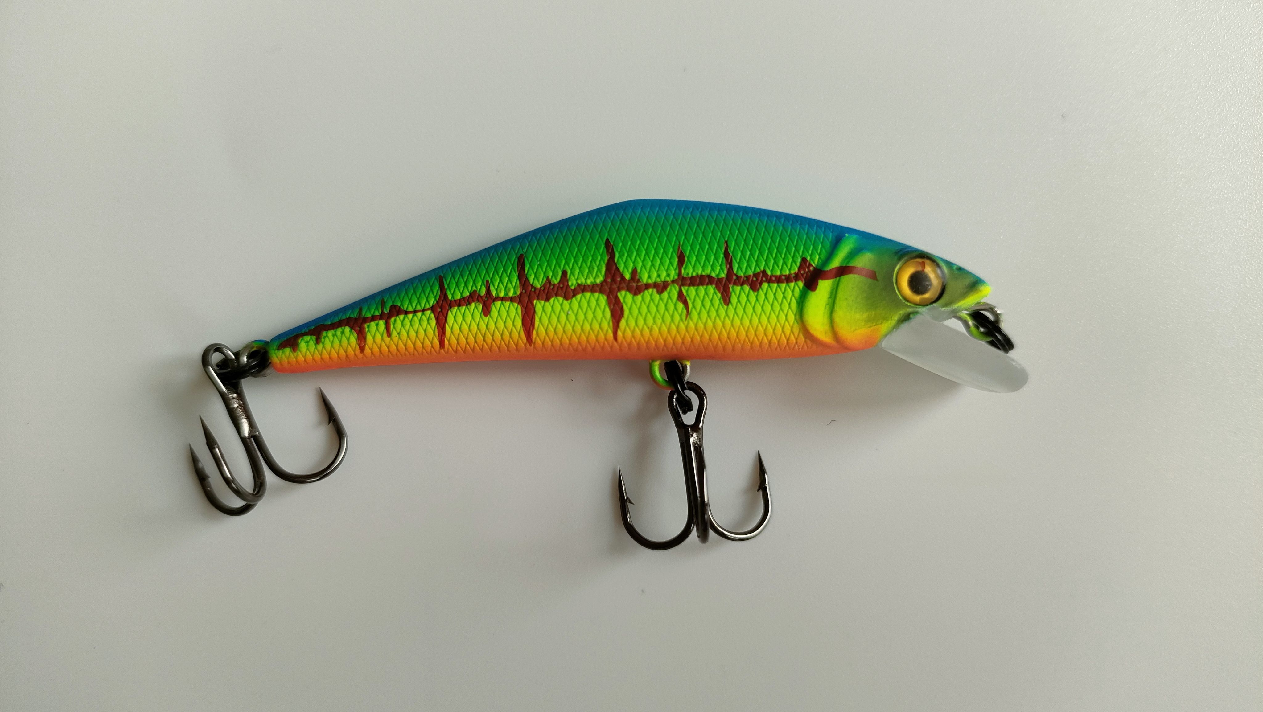Эта приманка особенно хороша для ловли в холодной воде. Обладает нейтральной плавучестью и заглубляется на 0,5–1 метр. Отлично имитирует мелкую рыбешку. Работает с разными типами проводки, но наилучшие результаты показывает при резких, агрессивных рывках.